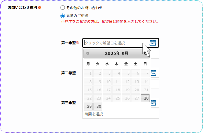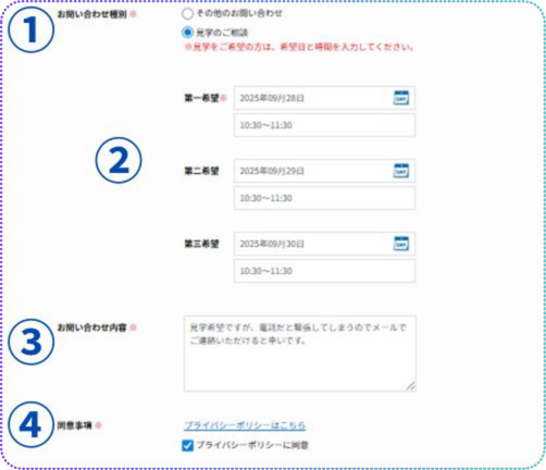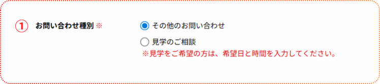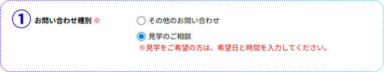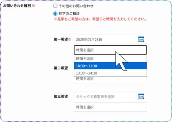 お問い合わせがしやすいように、順番と見学の希望を出しやすくしました。