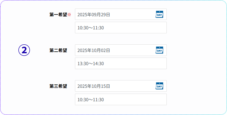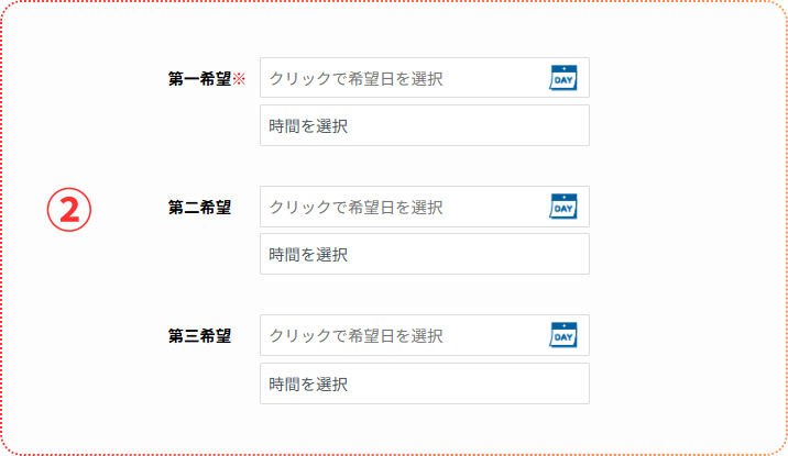 第一希望は必ず記入してください。二か月先まで記入可能です。希望時間は午前と午後の二択となっております。
