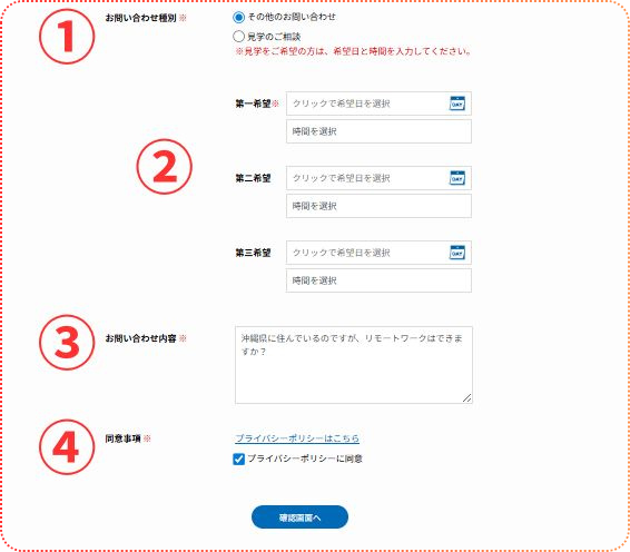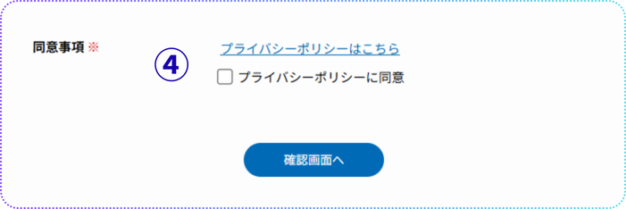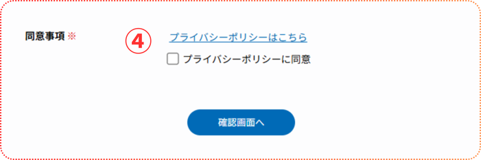 プライバシーポリシーをご確認のうえ、チェックを入れて確認画面へ移ってください。