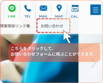 こちらの「お問い合わせ」の文字からでも、お問い合わせフォームへ飛ぶことができます。